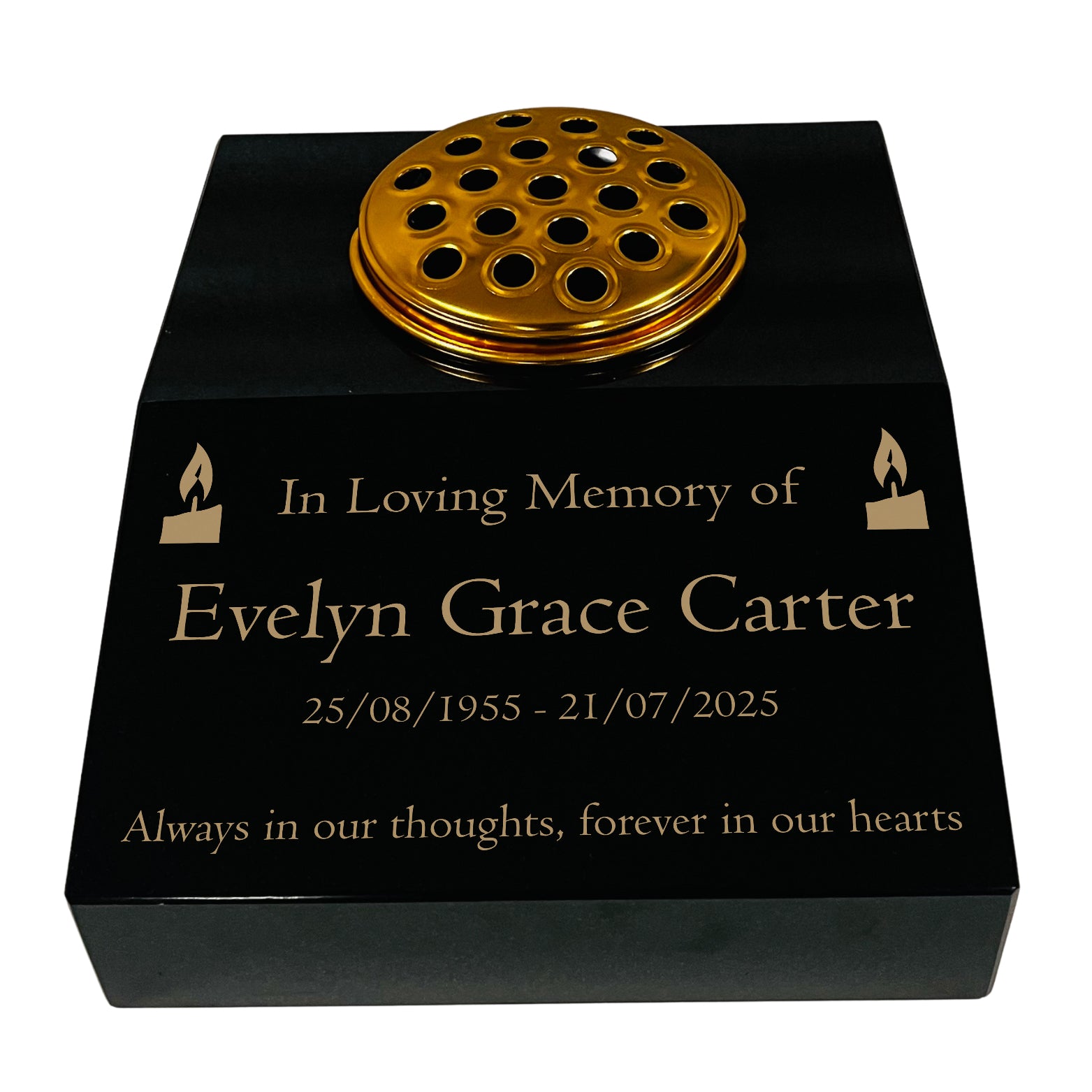 This black granite sloping memorial desk is made from solid premium black granite with a polished finish. It features a candle design and includes free gold-filled engraving for names, dates, or a short message. A gold-coloured metal flower vase insert is included, suitable for fresh or artificial arrangements. Each piece is expertly engraved and finished in the UK, ensuring lasting quality and durability.