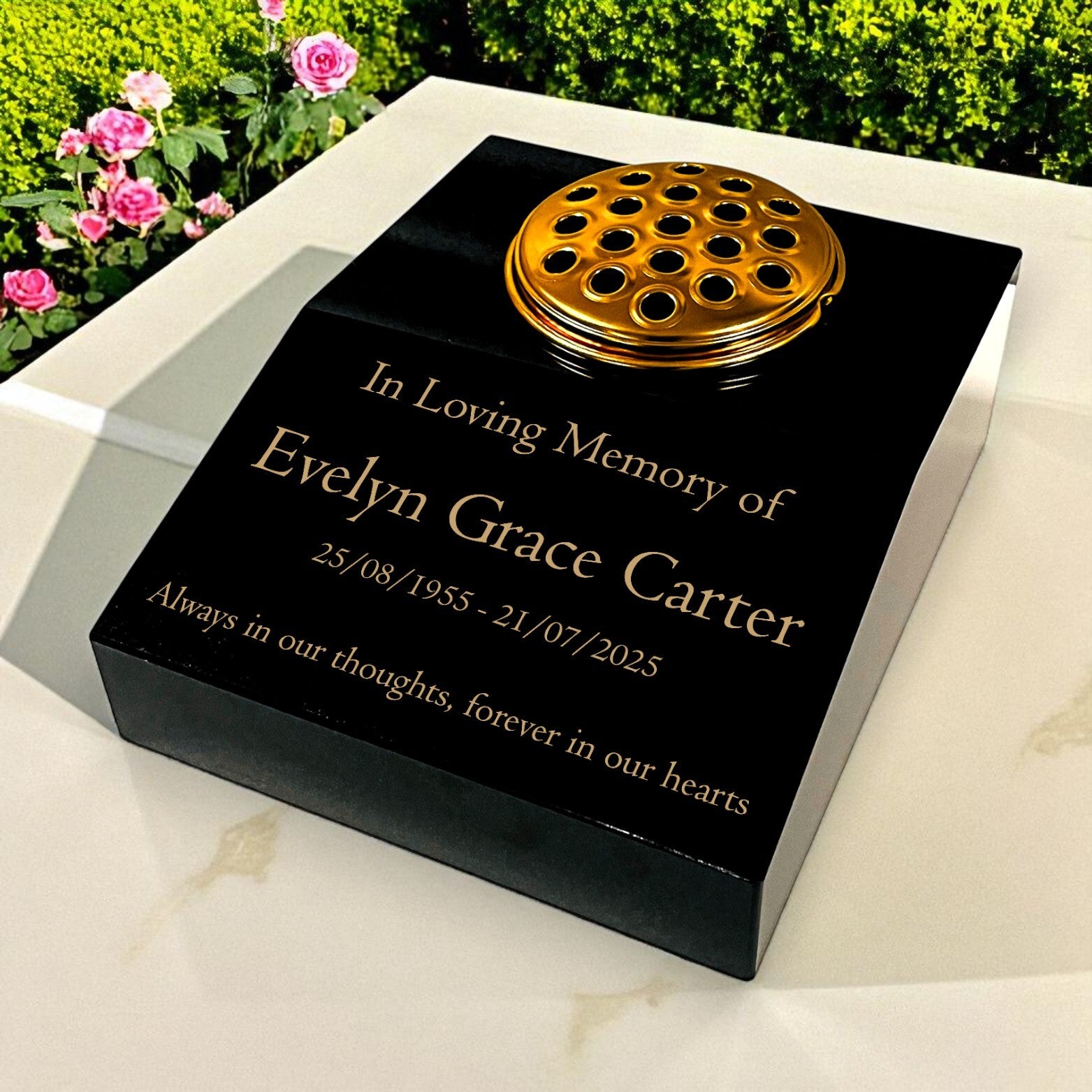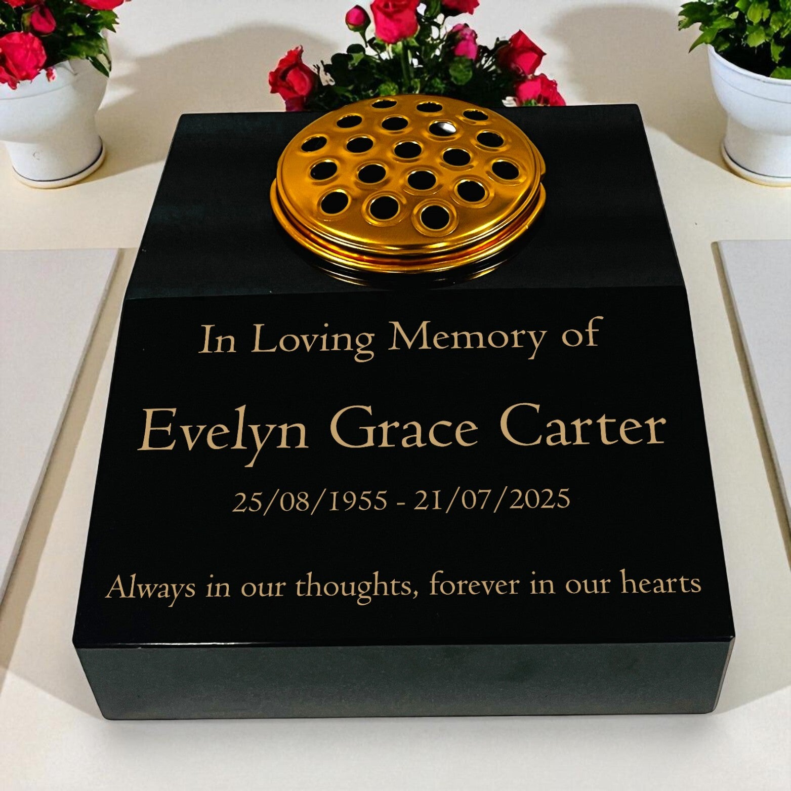 This black granite sloping memorial desk is made from solid premium black granite with a polished finish. It includes free gold-filled engraving for names, dates, or a short message. A gold-coloured metal flower vase insert is included, suitable for fresh or artificial arrangements. Each piece is expertly engraved and finished in the UK, ensuring lasting quality and durability.