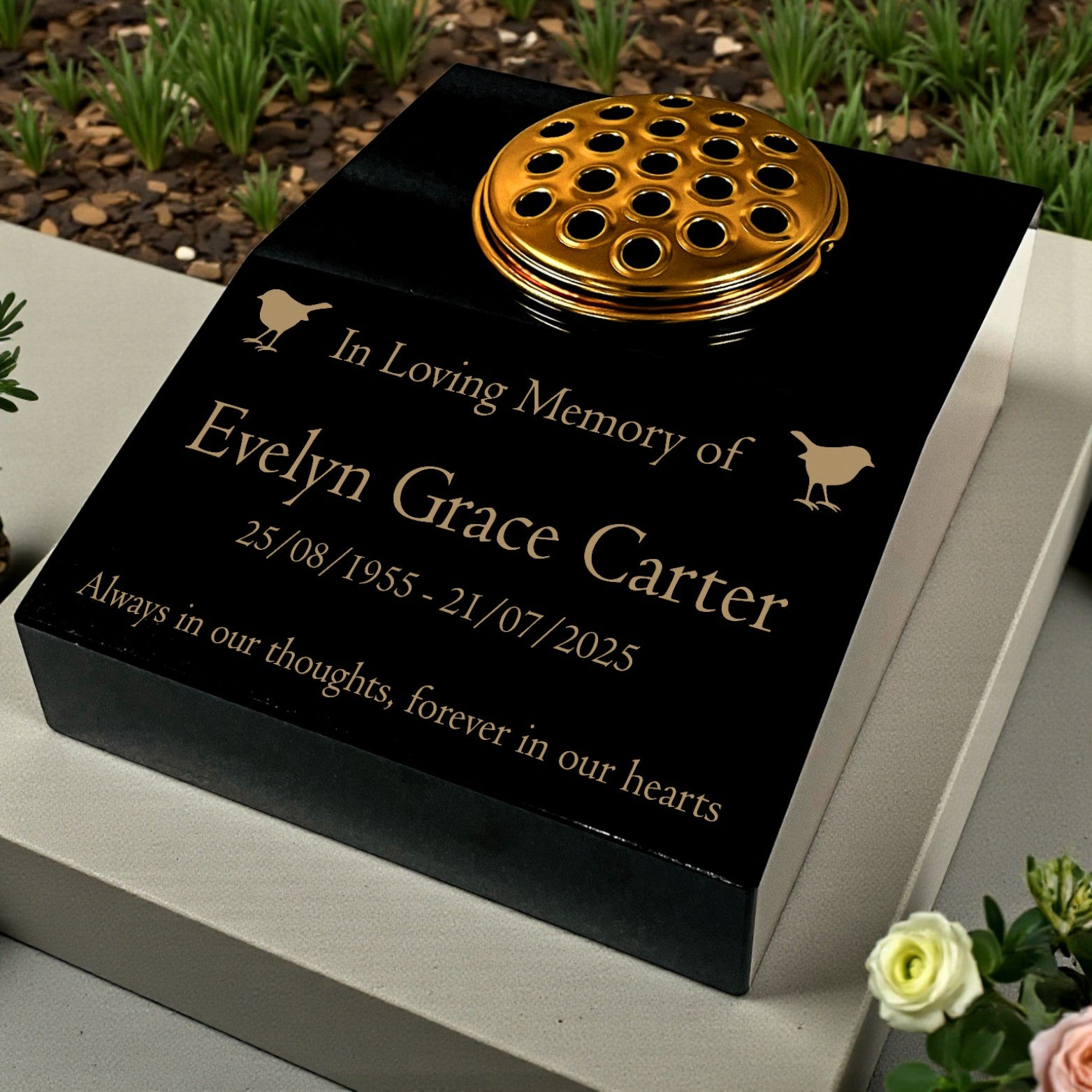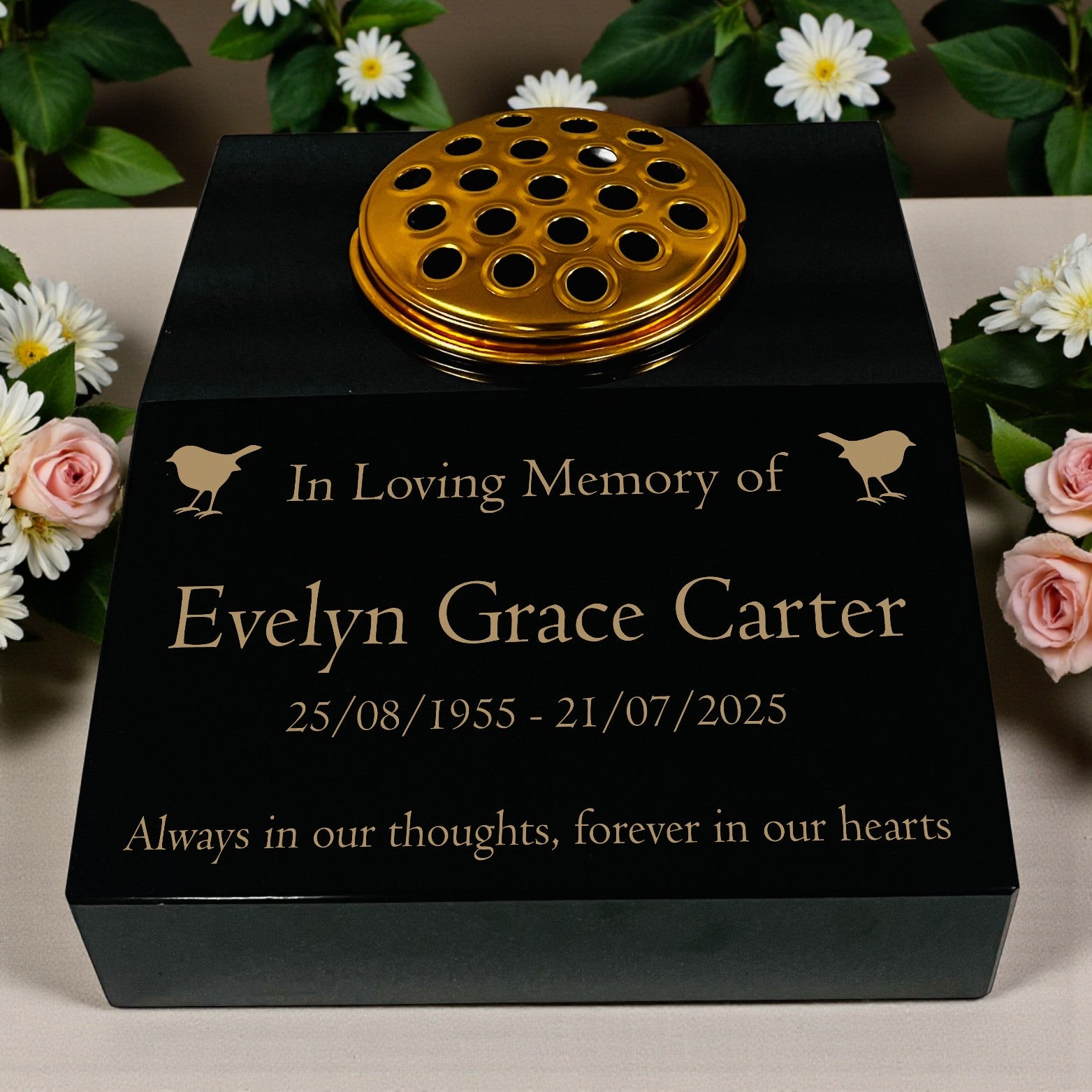 This black granite sloping memorial desk is made from solid premium black granite with a polished finish. It features a Robin design and includes free gold-filled engraving for names, dates, or a short message. A gold-coloured metal flower vase insert is included, suitable for fresh or artificial arrangements. Each piece is expertly engraved and finished in the UK, ensuring lasting quality and durability.