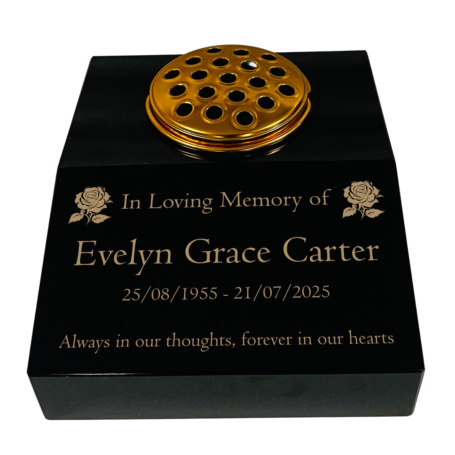 This black granite sloping memorial desk is made from solid premium black granite with a polished finish. It features a rose design and includes free gold-filled engraving for names, dates, or a short message. A gold-coloured metal flower vase insert is included, suitable for fresh or artificial arrangements. Each piece is expertly engraved and finished in the UK, ensuring lasting quality and durability.