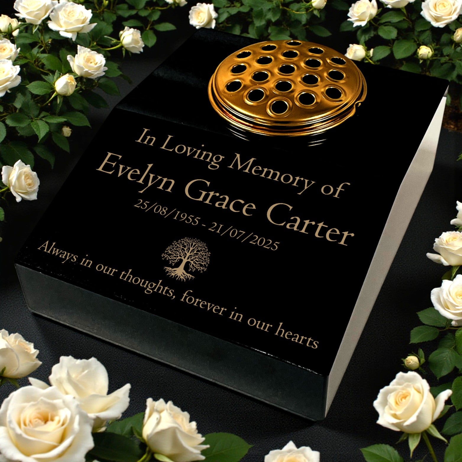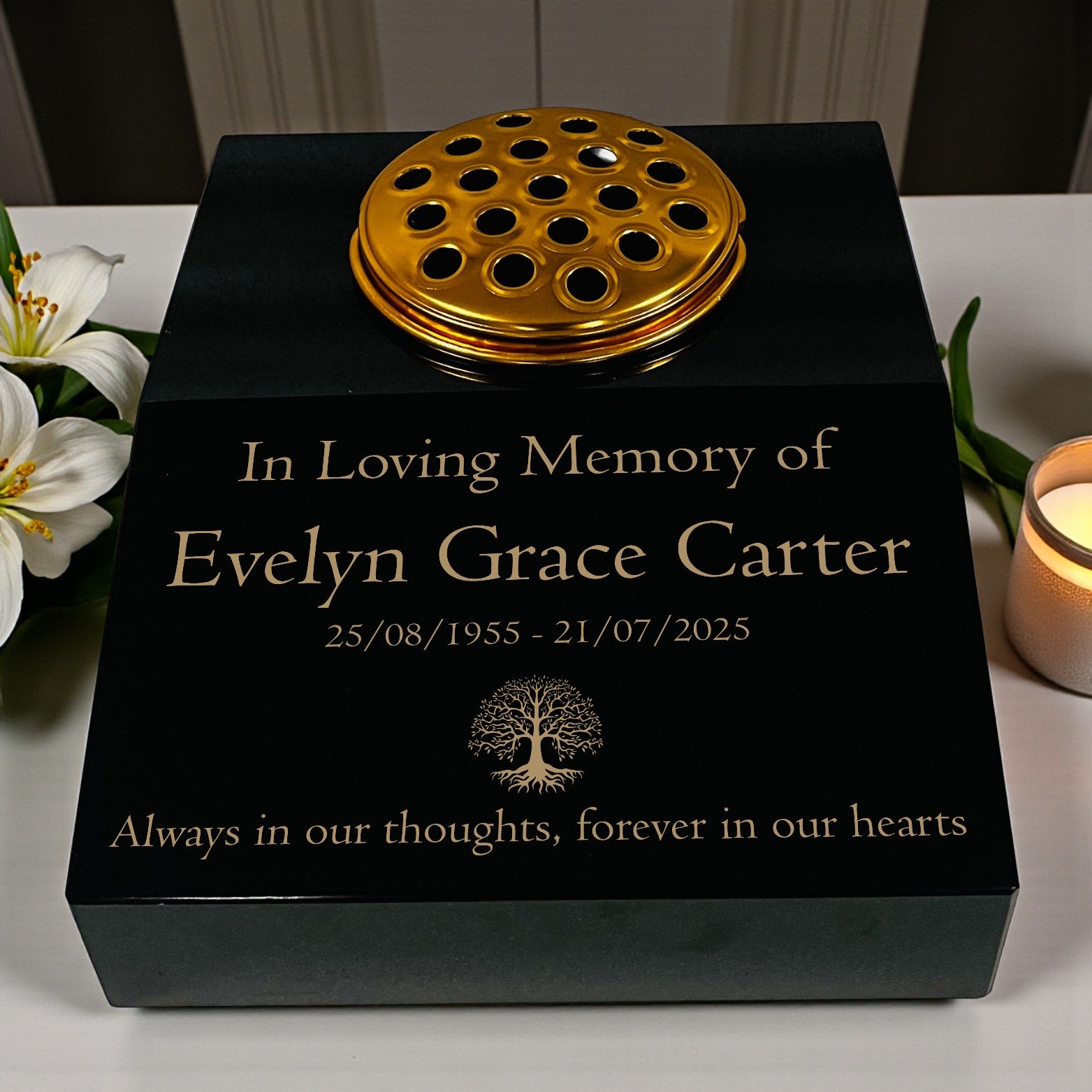 This black granite sloping memorial desk is made from solid premium black granite with a polished finish. It features a Tree of Life design and includes free gold-filled engraving for names, dates, or a short message. A gold-coloured metal flower vase insert is included, suitable for fresh or artificial arrangements. Each piece is expertly engraved and finished in the UK, ensuring lasting quality and durability.