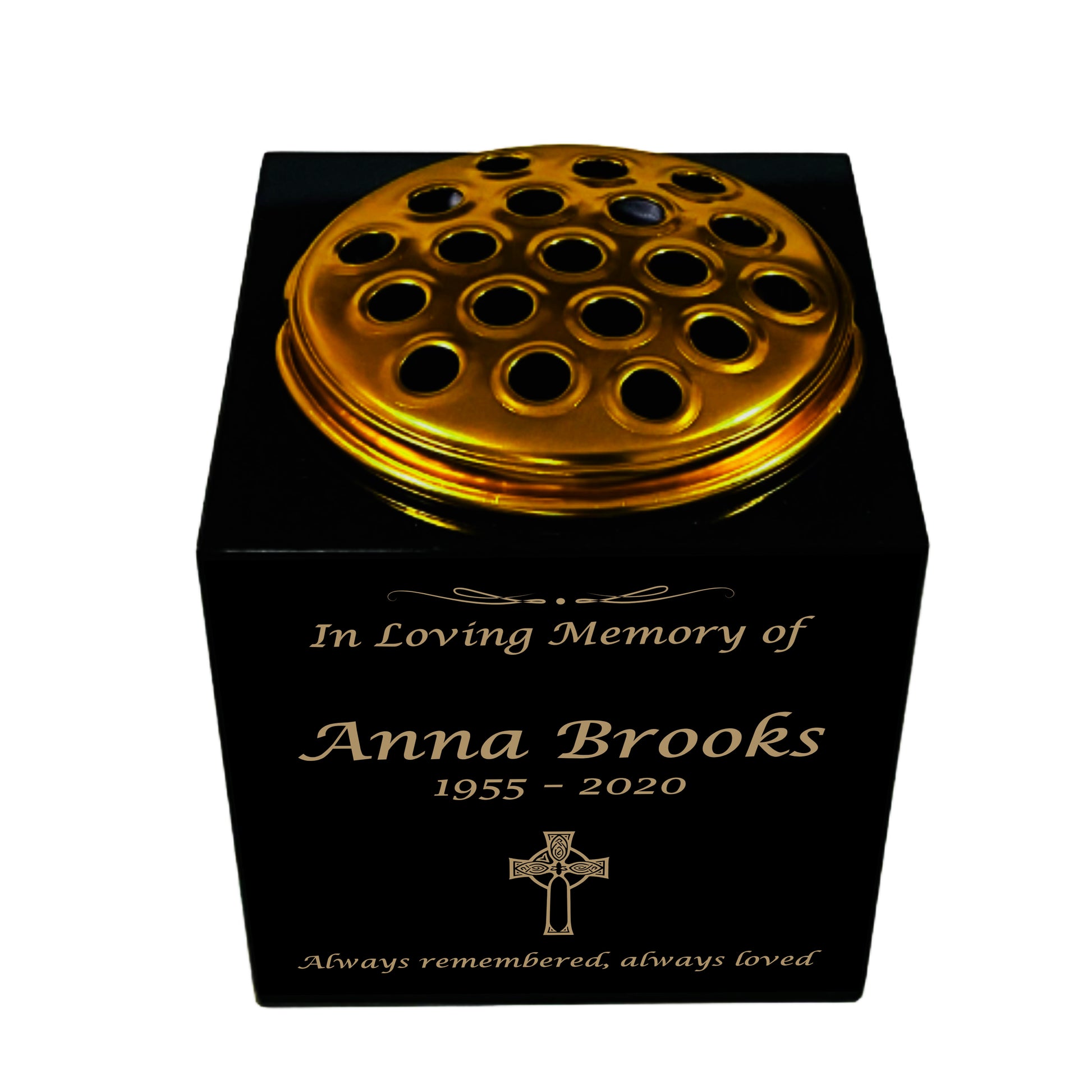 Premium Black Granite Memorial Vase- Solid Square Shape Vase – Free Personalised Gold Engraving - Celtic Cross – Metal Flower Insert – 3 different sizes available