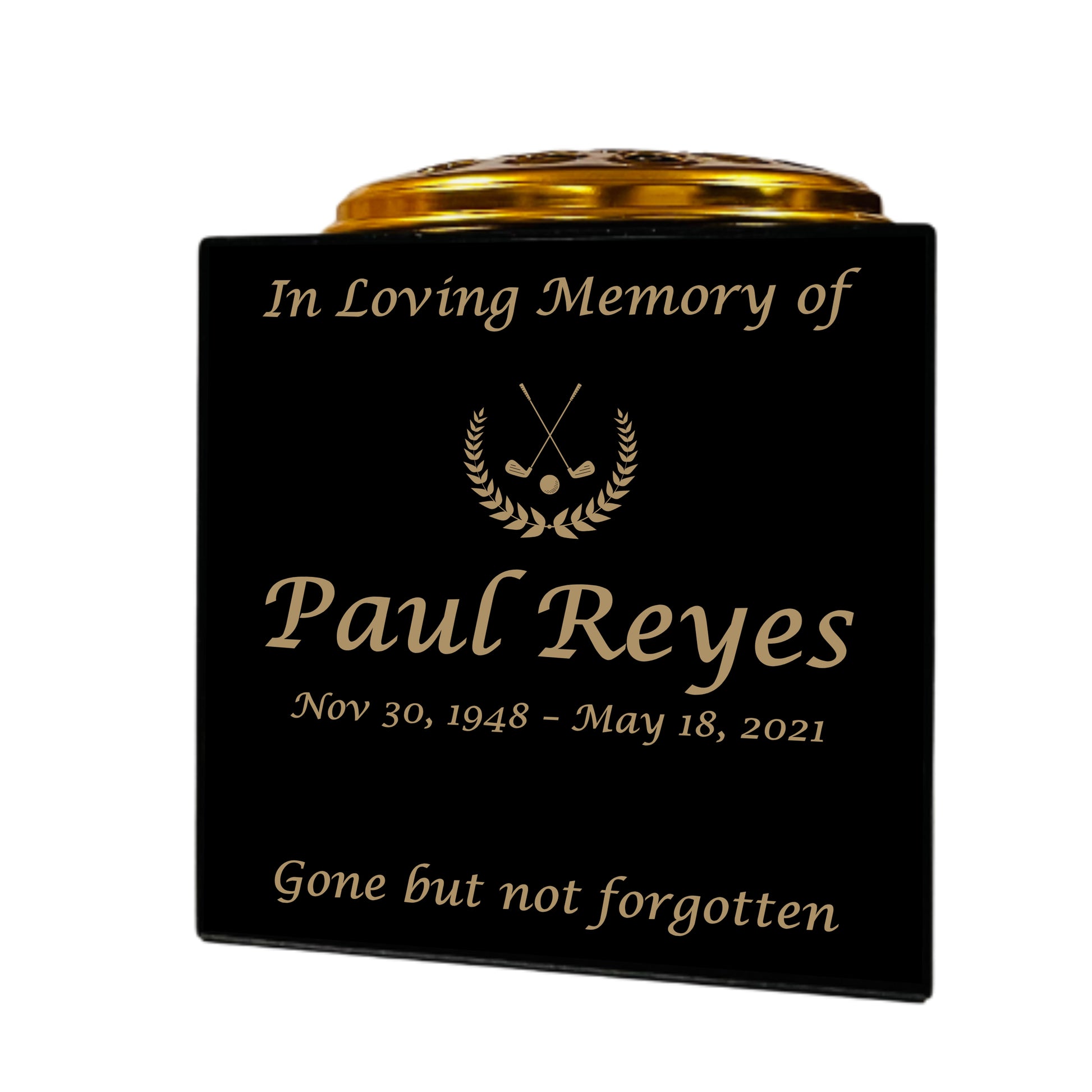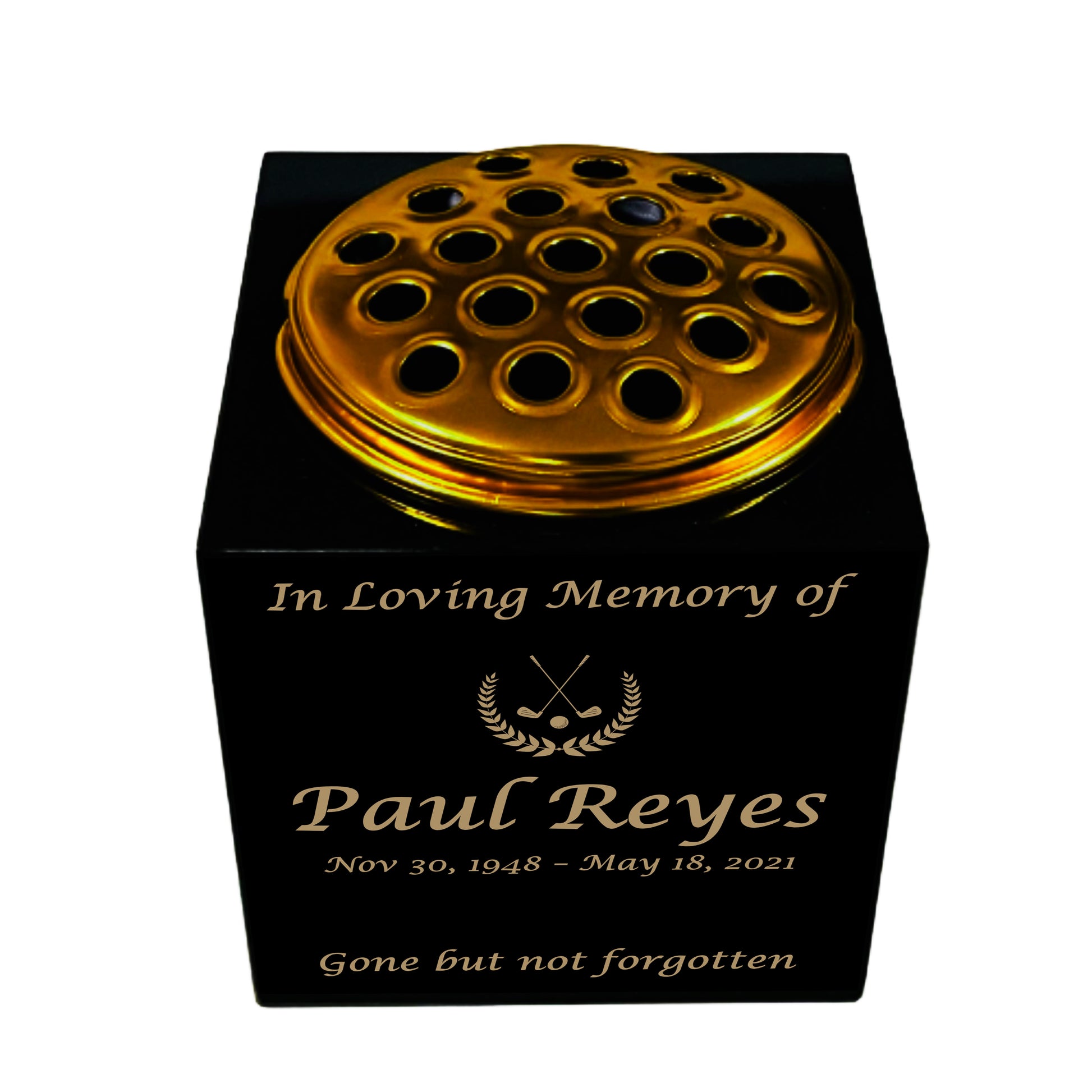 Premium Black Granite Memorial Vase- Solid Square Shape Vase – Free Personalised Gold Engraving - Golf Design – Metal Flower Insert – 3 different sizes available