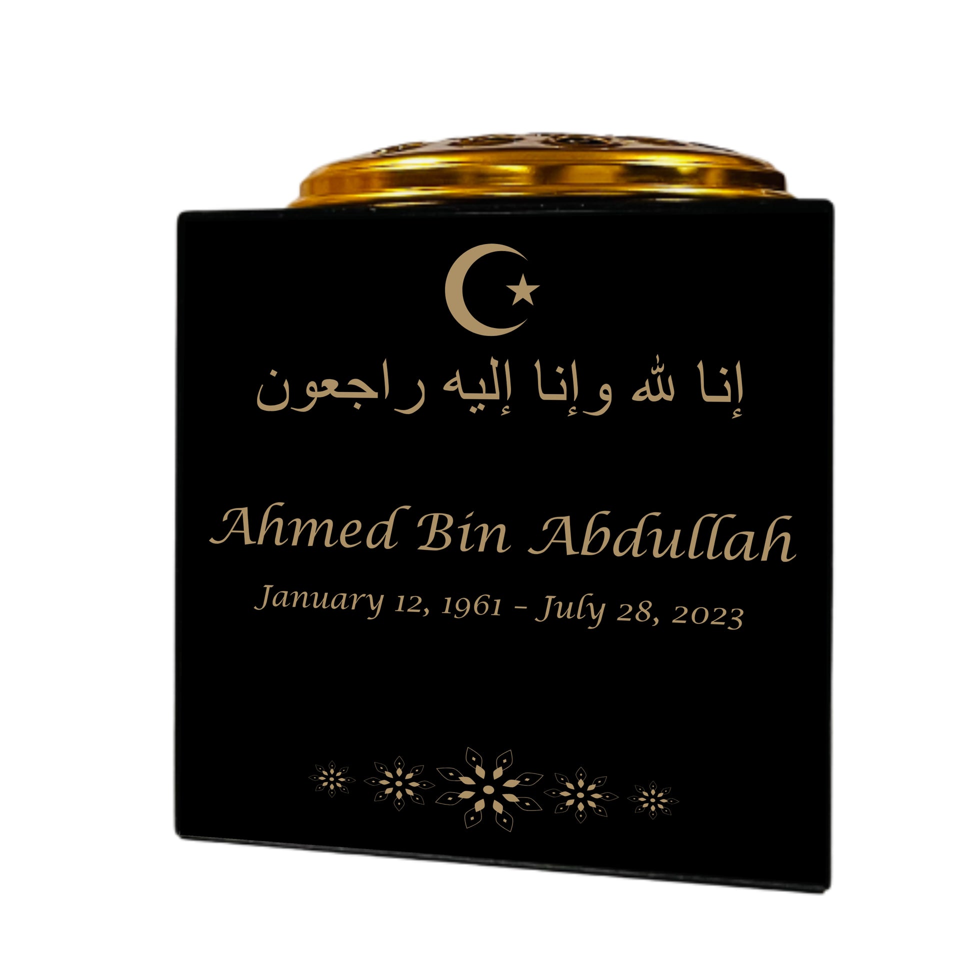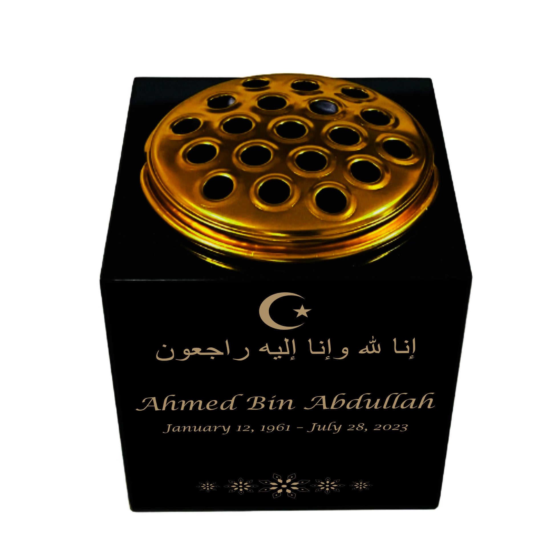 Premium Black Granite Memorial Vase - Solid Square Shape Vase – Free Personalised Gold Engraving - Islam 1 Design – Metal Flower Insert – 3 different sizes available