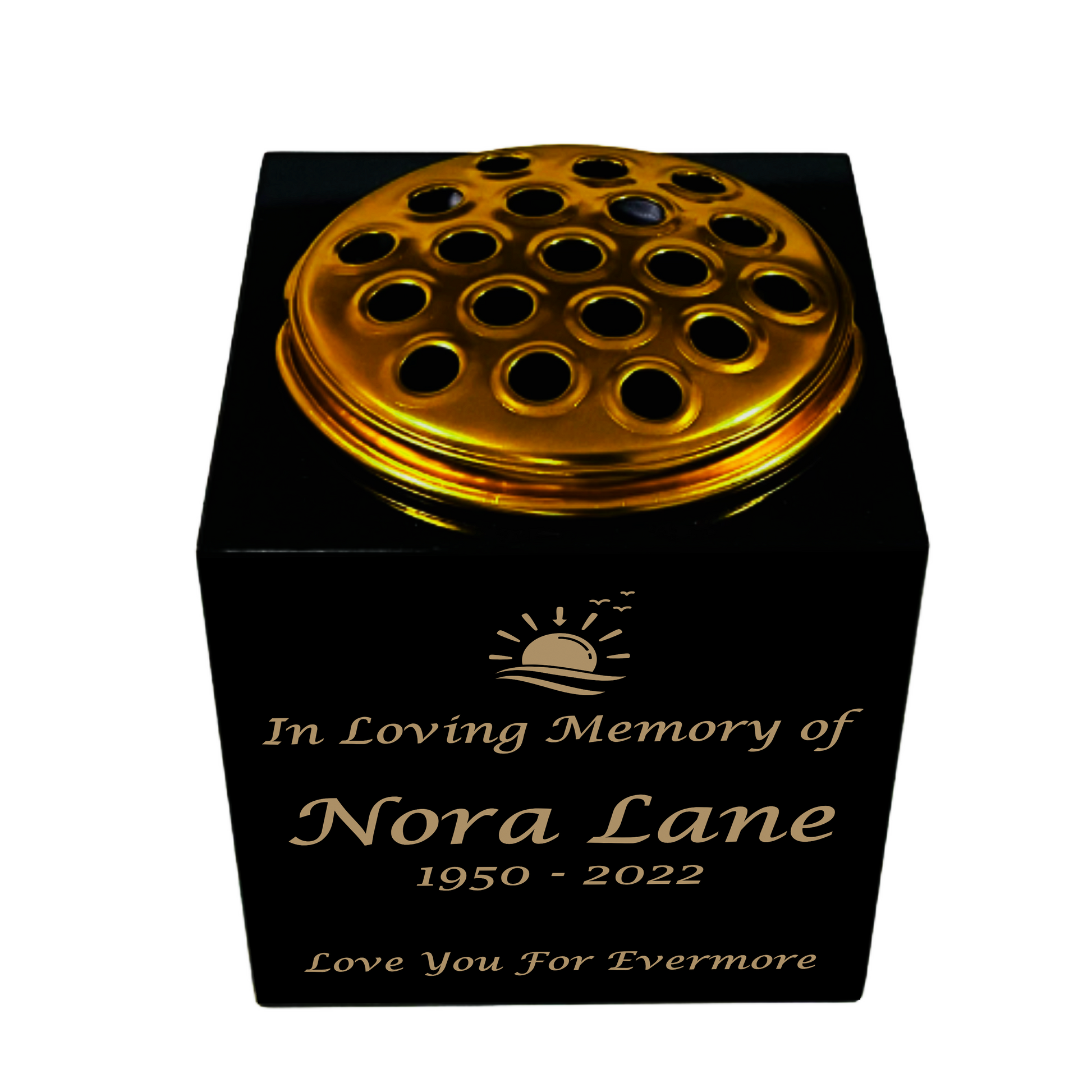 Premium Black Granite Memorial Vase- Solid Square Shape Vase – Free Personalised Gold Engraving - Sunset Design – Metal Flower Insert – 3 different sizes available