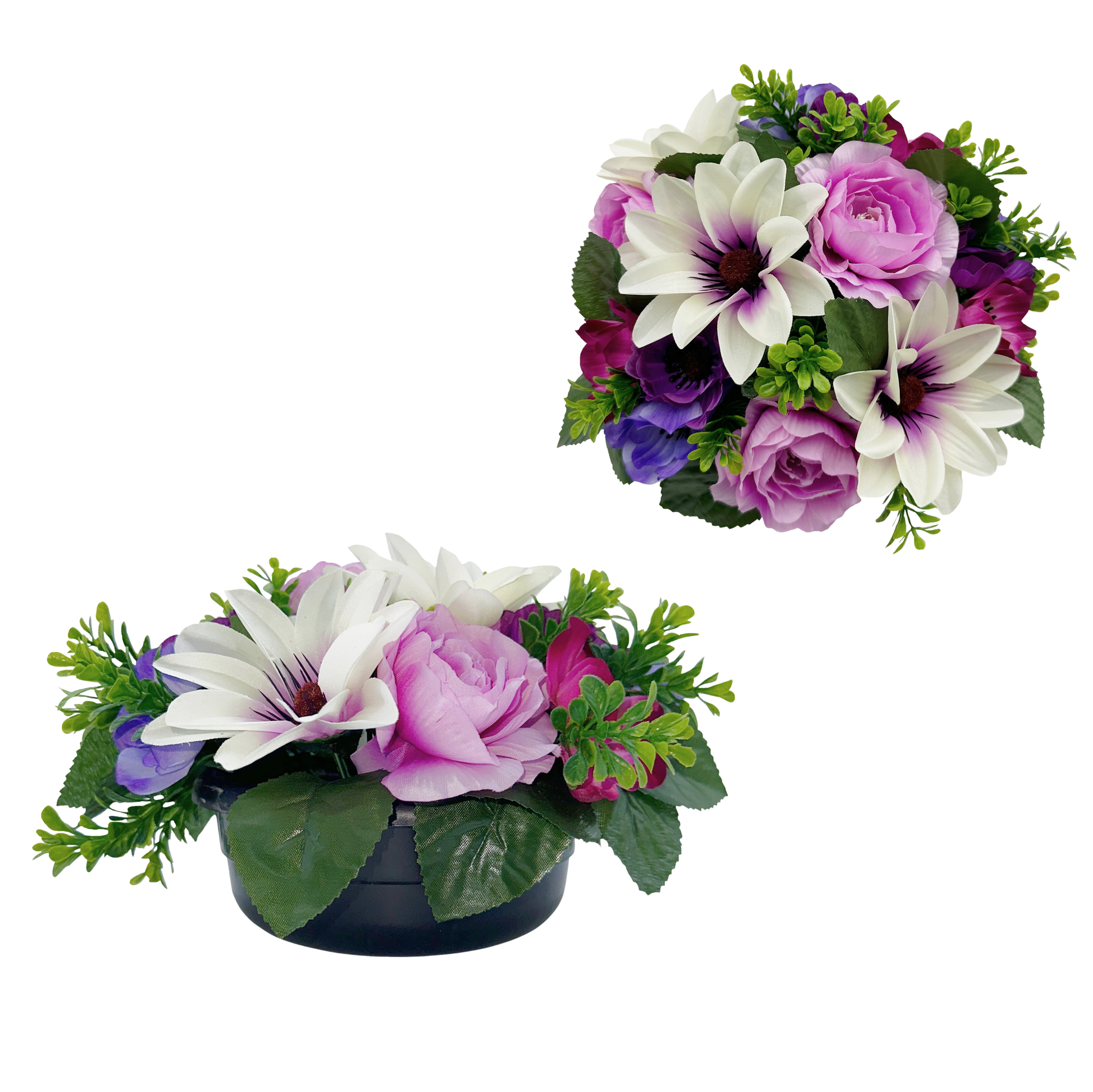 Add a soft, elegant touch to any memorial with this 24cm Lilac Dahlia with Camellia and Anemone arrangement in a sturdy weighted pot. Featuring a gentle blend of lilac and cream tones, this lifelike floral display provides a peaceful and lasting tribute for your loved one. Designed for outdoor use, it maintains its beauty in all weather conditions while requiring no maintenance.