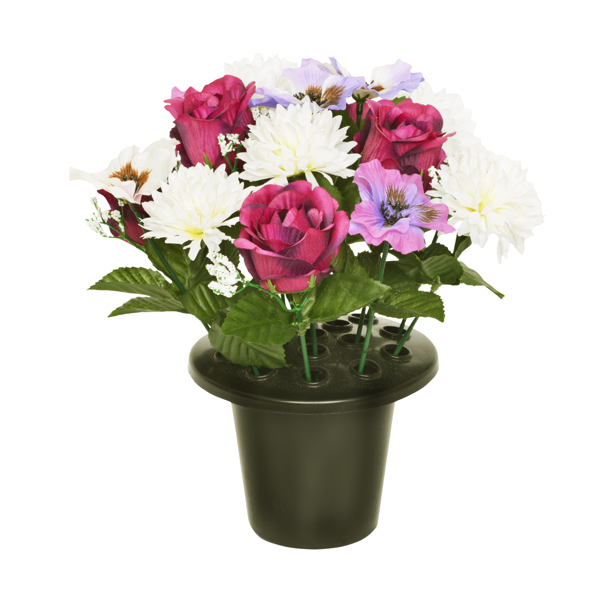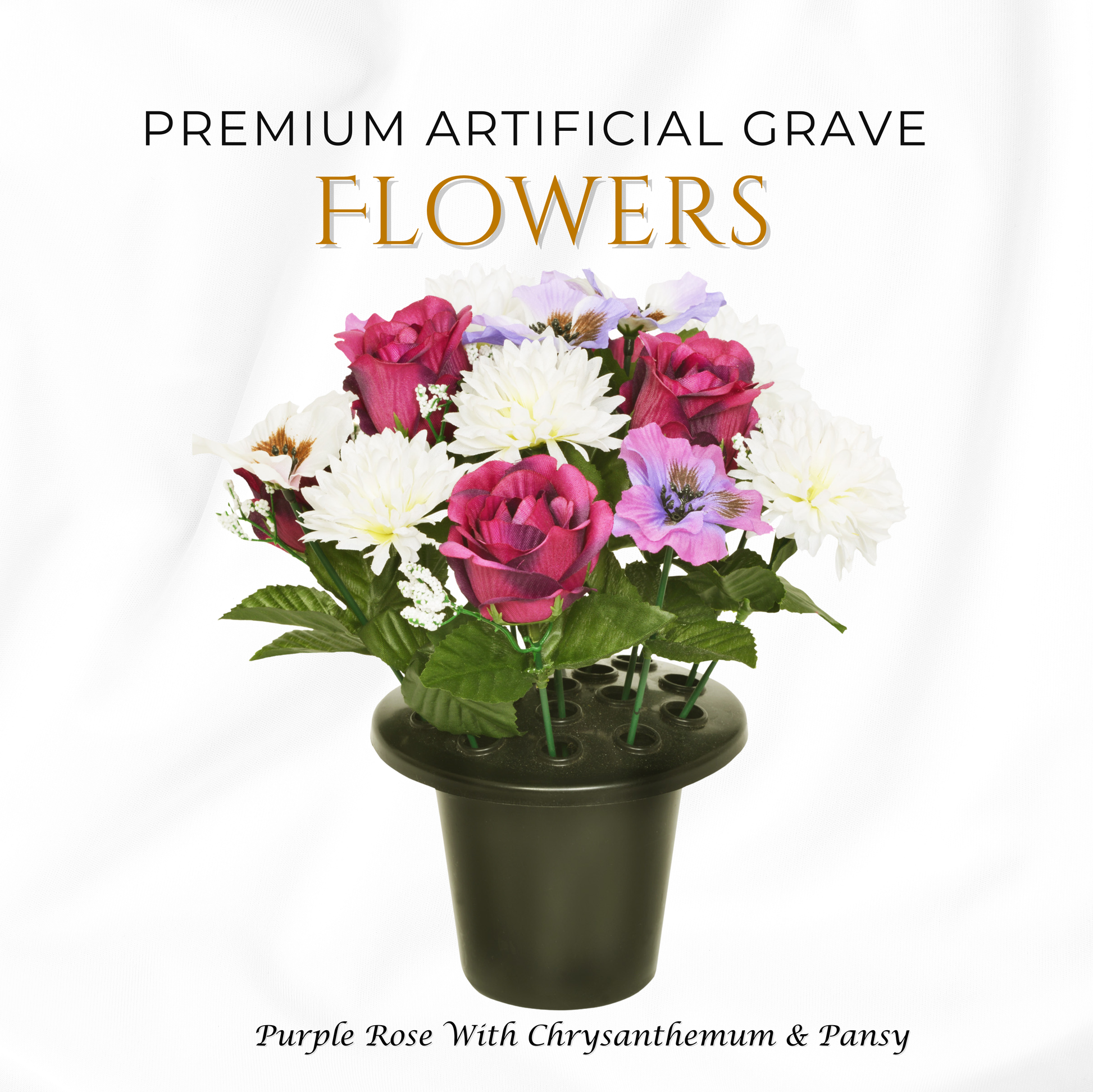 Premium Artificial Grave Flowers – 25cm Purple Rose With Chrysanthemum & Pansy | Memorial Vase Pot